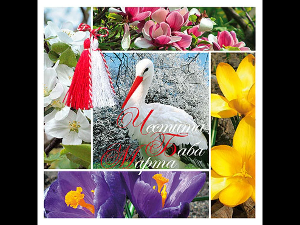 Ключови фрази: Картичка пожелание поздрави празник баба Марта цъфнали пролетни цветя щъркел пролет ухание животкрасота