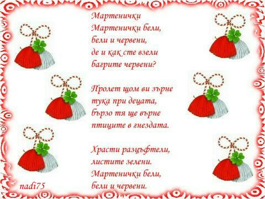 Пролет щом ви зърне тука при децата,бързо тя ще върне птиците в гнездата. Храсти разцъфтели,листите зелени.Мартенички бели,бели и червени.