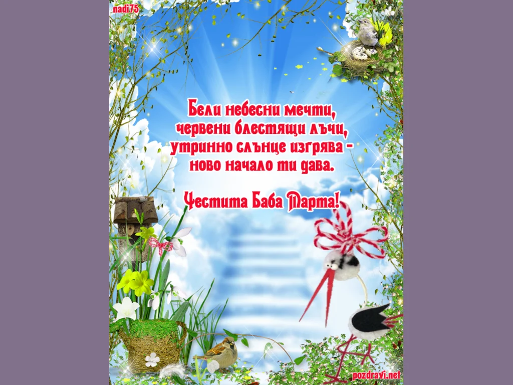 Ключови фрази: Кокичета щъркел птички гнездо синьо ясно небе лъчи зеленина мартеници пролетни цветчета живот красота природа ново начало