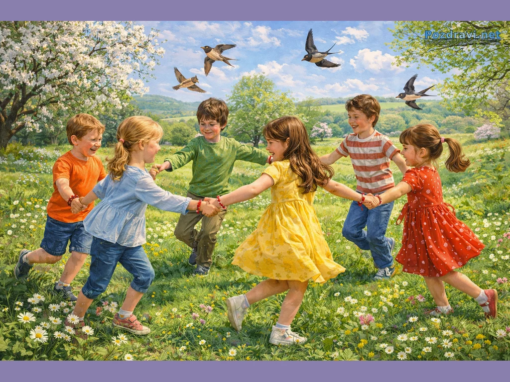 Детски празник с мартеници на поляната. Група деца играят на пролетна поляна, носят мартеници, а край тях прелитат врабчета и лястовички.