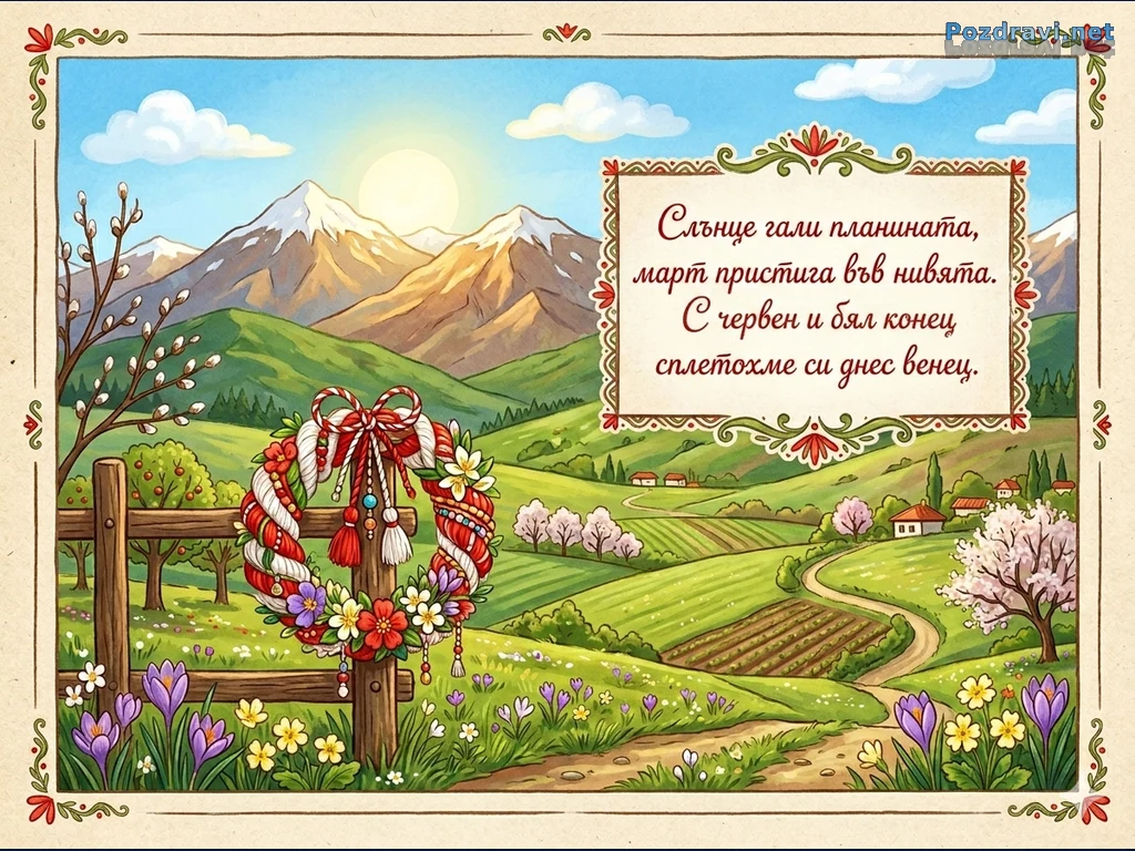 В предния план, на стара дървена ограда, виси традиционен български венец от мартеници. Този венец е изработен от червени и бели конци и прежди, усукани заедно, и украсен с мъниста, малки пискюли и цветя като минзухари, нарциси и други пролетни цветя. Около оградата цъфтят диви цветя.