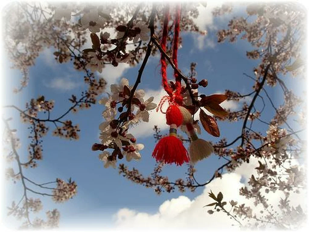 Ключови фрази: Картичка пролетно дърво цъфнало мартеница ражда живот честита Баба Марта поздрави пожелание