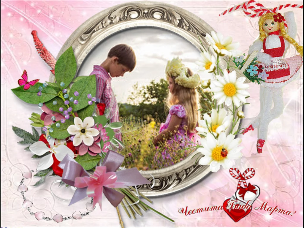 Ключови фрази: Типично Българска традиция мартенички бели червени пижо пенда букет пролетницветя слънце момиче момче панделка