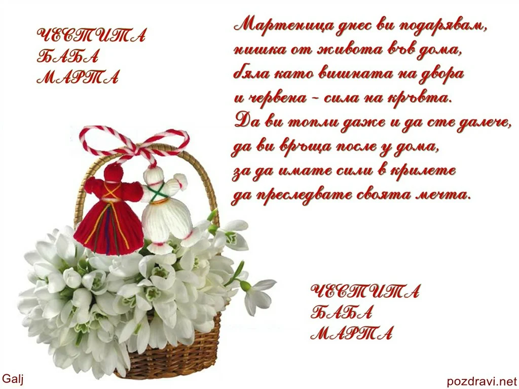 Ключови фрази: Честита баба марта!Картичка поздрави пожелание червено бяло мартенички любов пижо пенда букет кошница кокиче пролет красота любов