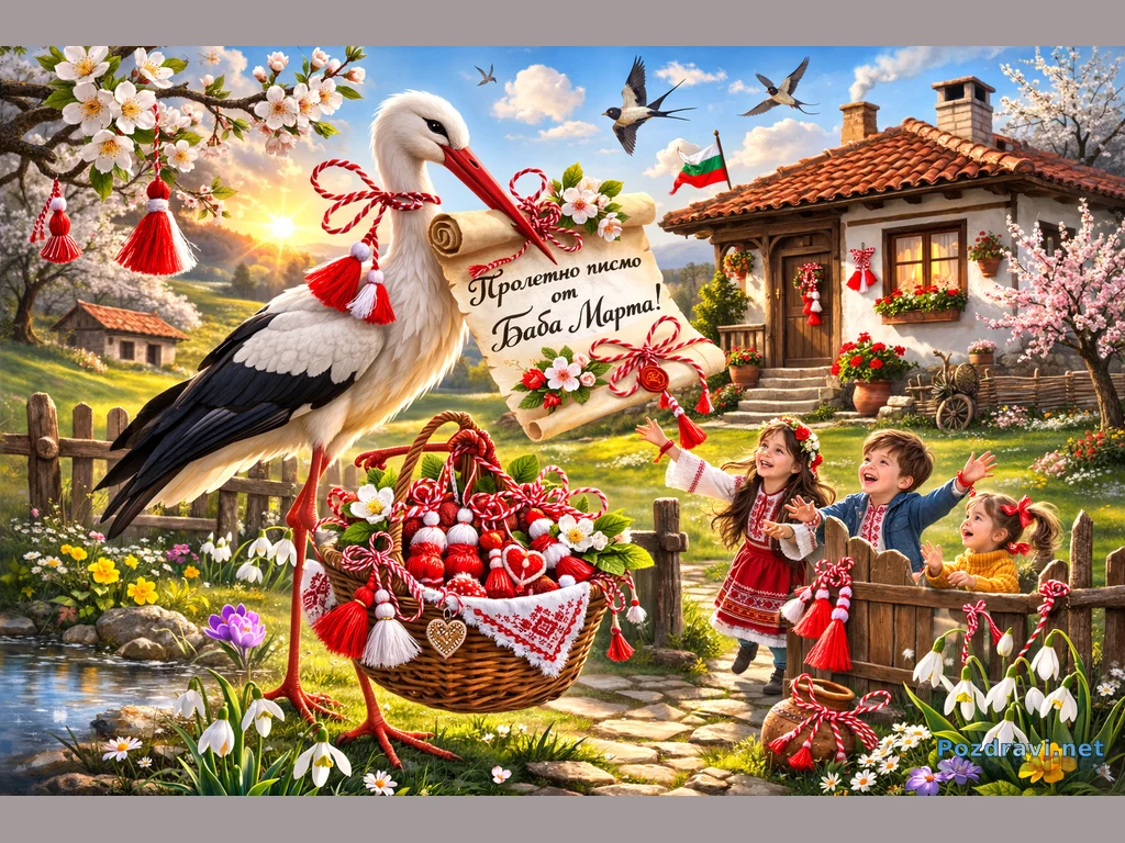 Голям щъркел носи пролетно писмо от Баба Марта. Той каца до къща с цъфнали дръвчета и носи кошница с мартеници за децата.