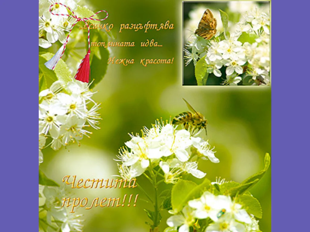 Ключови фрази: Картичка поздрави пожелание червено бяло мартенички любов пижо пенда букет цъфнало клонче кокиче пролет красота любов