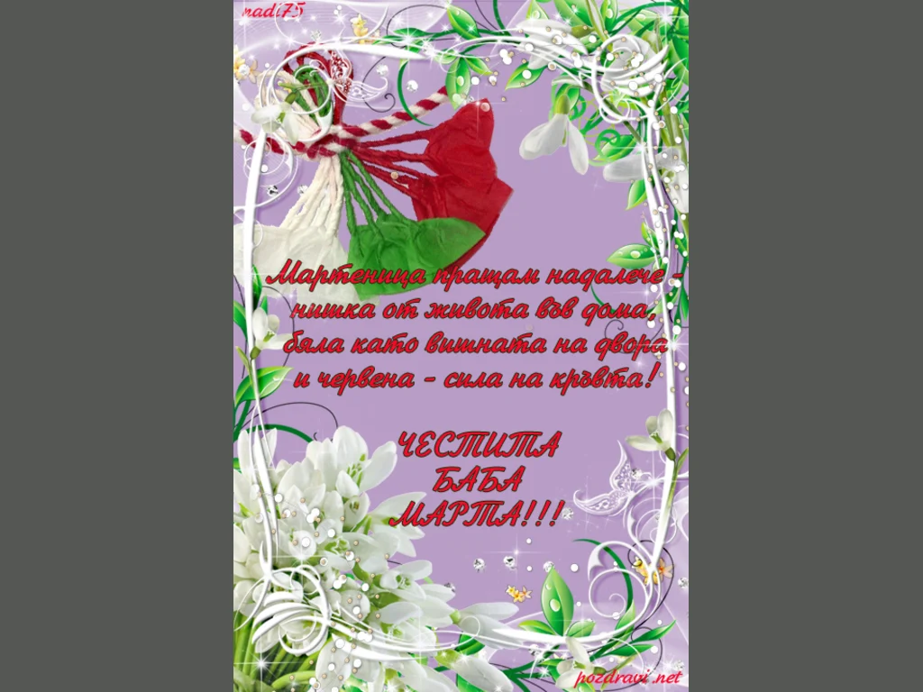Ключови фрази: Картичка типично българска традиция мартеница знаме кокичета поздрави всички далеч чужбина пожелание здраве търпение