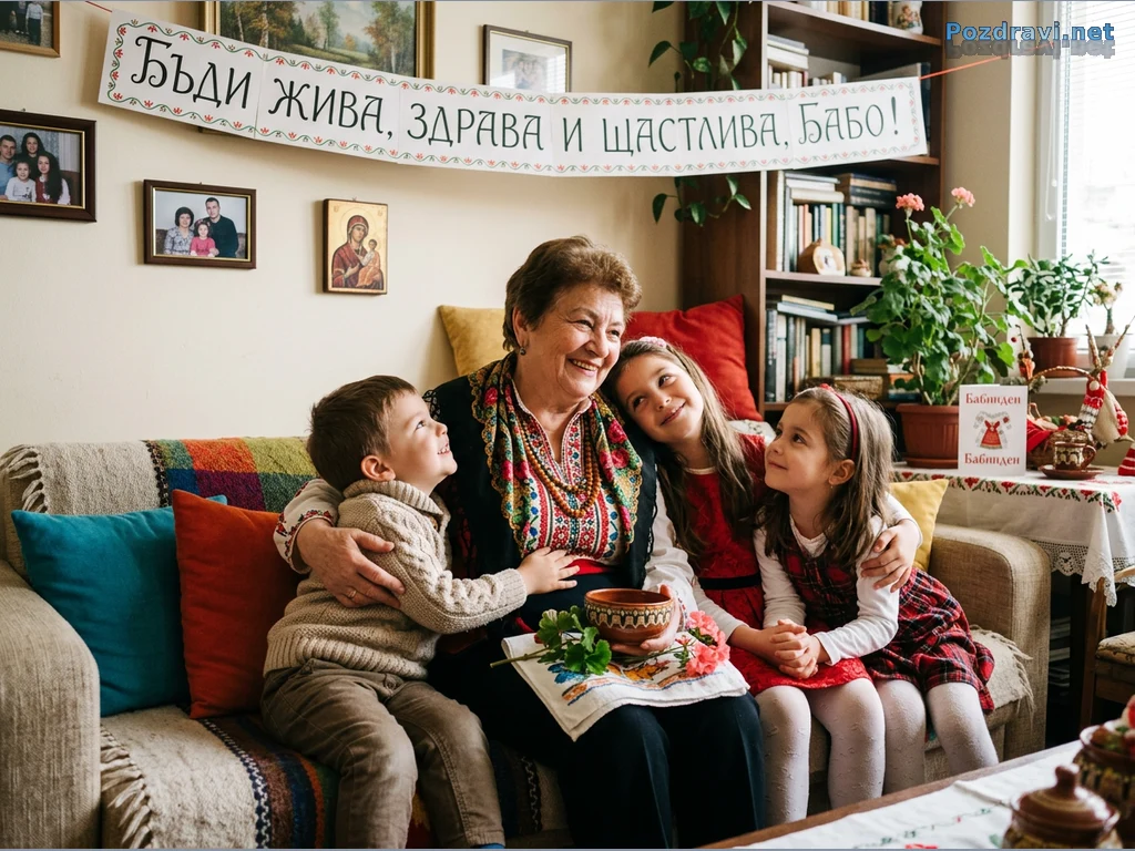 Възрастна жена с традиционна носия и шал седи на диван, обградена от три усмихнати деца. Момченцето и двете момиченца я прегръщат с любов, а тя ги гледа с нежност и щастие. Над тях виси празничен транспарант с надпис 'БЪДИ ЖИВА, ЗДРАВА И ЩАСТЛИВА, БАБО!'. В ръцете си бабата държи традиционна керамична купичка и цветя, а на масата се виждат картички с надпис 'Бабинден'. Сцената излъчва топлина, семейна обич и празник в уютен дом.