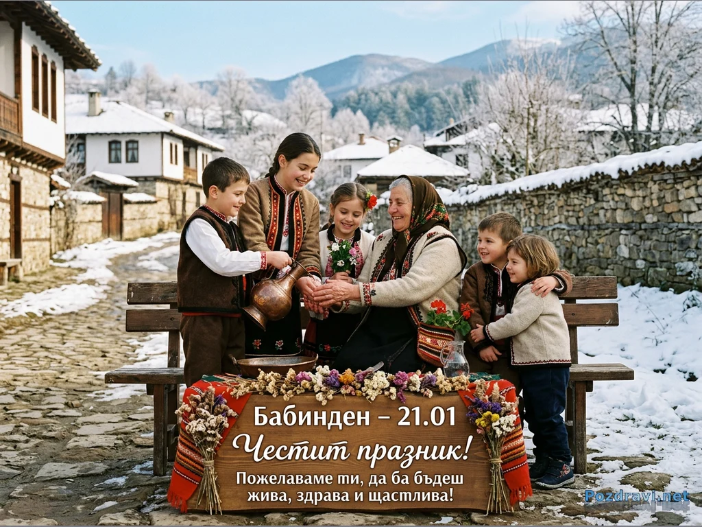 На снимката е изобразена група от възрастна жена и няколко деца, облечени в традиционни български носии, празнуващи Бабинден в заснежено село. Едно от момчетата полива вода от меден кюпюр върху ръцете на бабата, докато другите деца с усмивки подават цветя. Сцената е на фона на калдъръмена улица и стари каменни къщи, покрити със сняг, а на заден план се виждат заснежени планини. В преден план има дървена табела с надпис 'Бабинден – 21.01 Честит празник!', украсена със сухи цветя и народни мотиви. Атмосферата е празнична и топла, отразяваща духа на българските традиции.