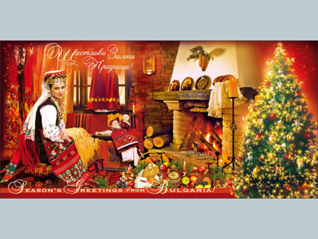 Ключови фрази: Бъдни вечер камината горяща топлина уют софра пълна гозби кравайчета вкусни семейство щастливо посреща сега Коледа празник обичан всички девойка традиционна носия българска коледна елха украсена красива изящна
