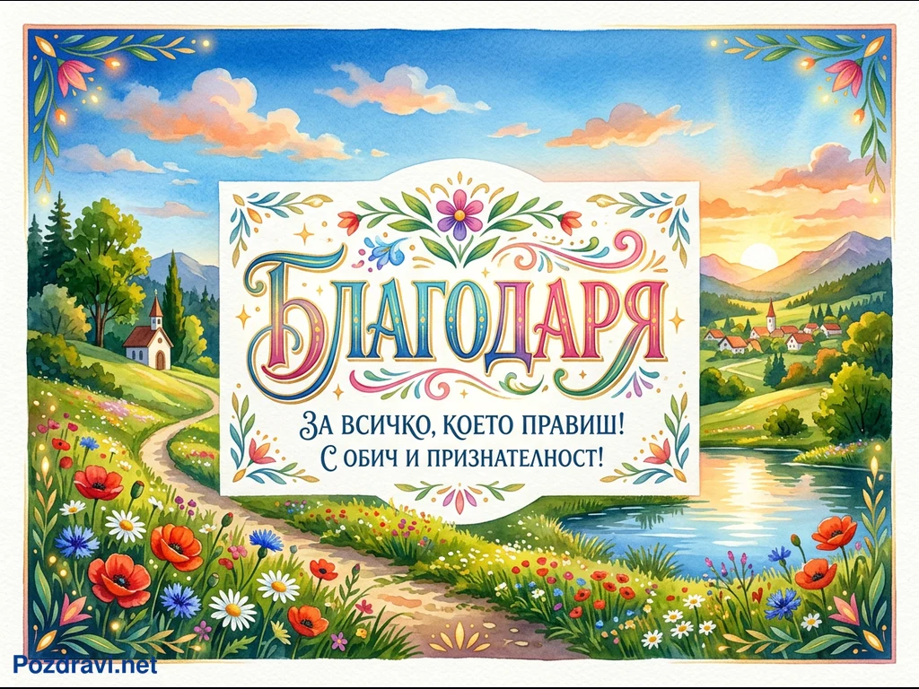 Тази живописна картичка в акварелен стил изобразява идиличен пейзаж. В центъра е разположен декоративен надпис 'БЛАГОДАРЯ ЗА ВСИЧКО, КОЕТО ПРАВИШ! С ОБИЧ И ПРИЗНАТЕЛНОСТ!', обграден от цветни орнаменти. Около него се вие пътека през поле с макове, метличини и маргаритки, водеща към езеро и село на залез слънце отдясно, и малка църква на хълм отляво. Цялата композиция е рамкирана от флорални гирлянди с приказни светлинки, създаващи топла и благодарствена атмосфера.
