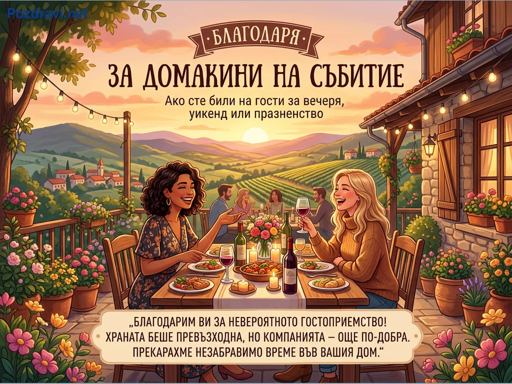 На картичката са изобразени две усмихнати жени, които се смеят и вдигат тост с чаши вино на маса, отрупана с храна и напитки. Те са на тераса, украсена с цветя и висящи лампички, с изглед към живописен тоскански пейзаж със залеза над хълмове и лозя. На заден план се виждат и други гости, наслаждаващи се на вечерята. Основният текст изразява благодарност към домакините за събитие, уикенд или празненство, подчертавайки невероятното гостоприемство и приятната компания.