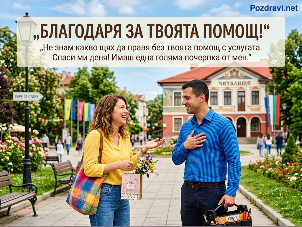 Снимката показва усмихната жена, която благодари на мъж в оживена градска среда. Жената, облечена в жълта блуза, държи подаръчна торбичка с цветя и носи цветна чанта, докато мъжът, с раирана синя риза, държи чанта с инструменти, обозначена като 'Услуги'. Те стоят на алея с пейки и цветни лехи, а на заден план се вижда сграда с надпис 'ЧИТАЛИЩЕ' и български знамена. Над тях е изписано послание за благодарност: 'БЛАГОДАРЯ ЗА ТВОЯТА ПОМОЩ! Не знам какво щях да правя без твоята помощ с услугата. Спаси ми деня! Имаш една голяма почерпка от мен.' Сцената излъчва позитивно взаимодействие и признателност за извършена услуга.