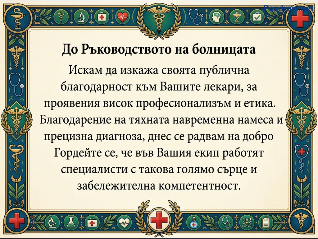 Ключови фрази: Благодарност към лекари, Медицинска благодарност, Сертификат за болница, Професионализъм в медицината, Признателност към доктори