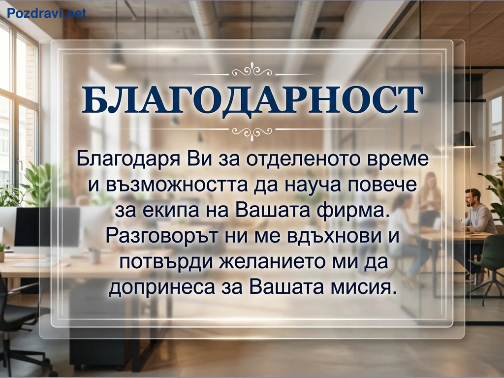 Ключови фрази: Благодарствена картичка, Благодарност за интервю, Професионална благодарност, Съобщение за признателност, Офис фон благодарност