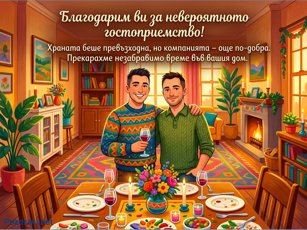 На картичката са изобразени двама усмихнати мъже, прегърнати, стоящи зад богато подредена трапеза. Масата е отрупана с чинии, чаши за вино, свещи и цветен букет, създавайки празнична атмосфера. Зад тях се вижда уютна всекидневна с камина, украсена с гирлянди, рафтове с книги, стайни растения и пъстър килим. Обстановката е топла и гостоприемна, подчертавайки посланието за благодарност, изписано в горната част на картичката. Текстът гласи: 'Благодарим ви за невероятното гостоприемство! Храната беше превъзходна, но компанията – още по-добра. Прекарахме незабравимо време във вашия дом.'