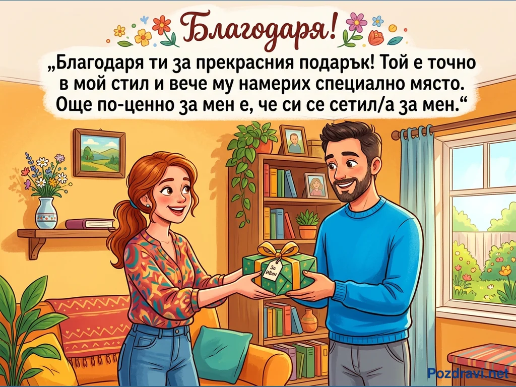 На картичката е изобразена усмихната жена с червена коса, която подава зелен подарък с жълта панделка на усмихнат мъж с брада. Действието се развива в уютна всекидневна с диван, лавица с книги и прозорец, разкриващ градина. Над тях е изписано 'Благодаря!' и цитат, изразяващ признателност за подаръка и жеста. Подаръкът е адресиран 'За Иван', което подсказва личен повод, а цялостната атмосфера е топла и изпълнена с благодарност.