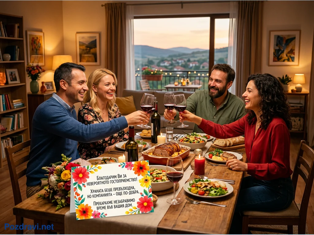 Четирима приятели се наслаждават на празнична вечеря в уютна домашна обстановка. Те вдигат наздравица с чаши червено вино, усмихнати и щастливи. Масата е отрупана с вкусна храна, включваща печено месо, салати и хляб, осветена от мека светлина на свещи. На заден план голям прозорец разкрива живописен залез над хълмист пейзаж с китно селце. На преден план е поставена благодарствена картичка с цветен дизайн и букет цветя.