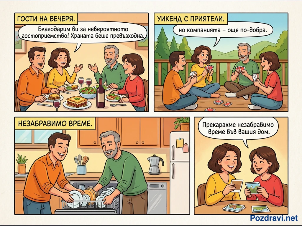 Комиксът от четири панела изобразява сърдечни моменти, споделени между две двойки – една по-млада и една по-възрастна. В първия панел те се наслаждават на вечеря, като гостите изразяват благодарност за гостоприемството и отличната храна. След това, на открито, четиримата играят карти, подчертавайки удоволствието от добрата компания през уикенда. Последните панели показват мъжете, които заедно мият чинии, и жените, разглеждащи снимки, символизирайки незабравимо прекарано време и топли спомени в дома на домакините.