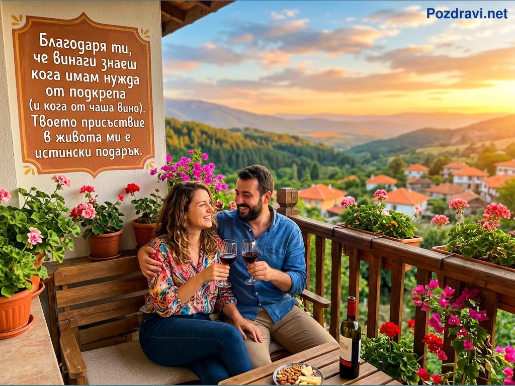 Млада двойка се наслаждава на романтична вечер на балкон с живописен изглед към планински пейзаж. Те държат чаши с червено вино и се усмихват щастливо един на друг, докато слънцето залязва над хълмовете и разпръснатите къщички на селото. Балконът е богато украсен с цветя в саксии, а на дървената маса пред тях има бутилка вино, сирене и ядки. На стената зад тях е изписано трогателно послание, изразяващо благодарност за подкрепата и присъствието в живота. Цялата сцена излъчва уют, любов и спокойствие.