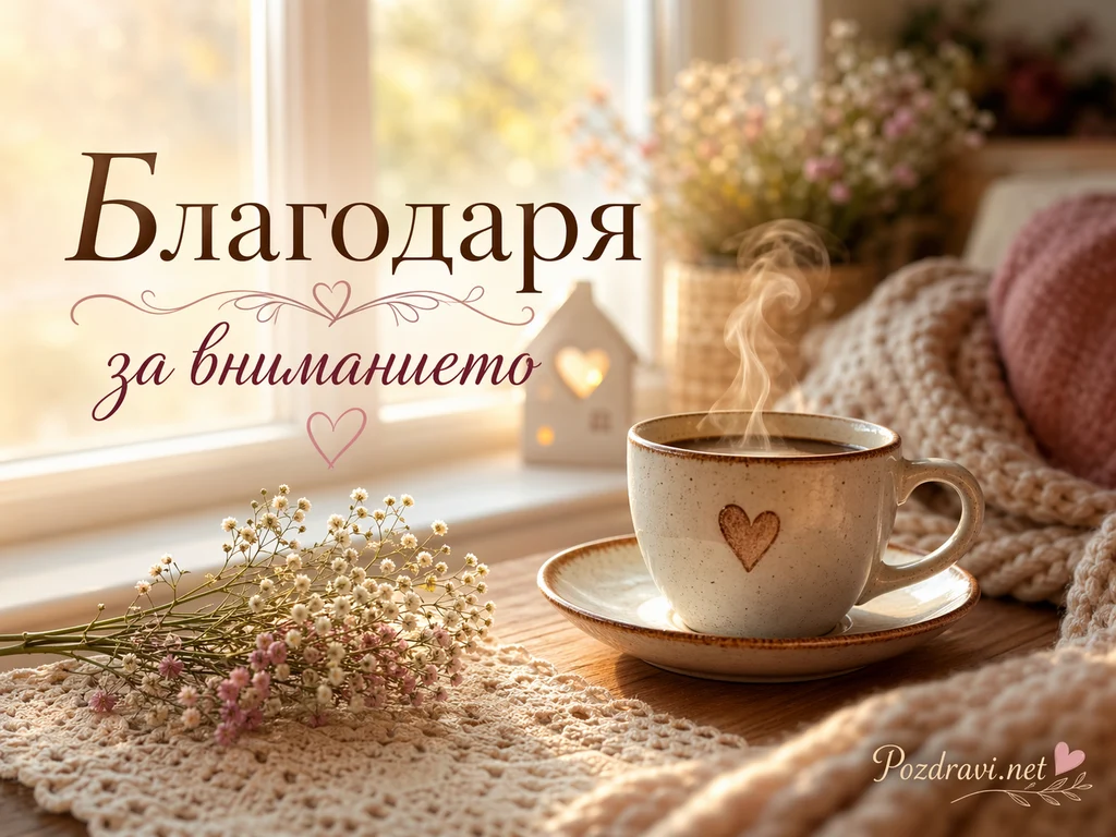 Топла есенна светлина се разлива през прозореца и изпълва стаята с мек златист блясък. На дървената маса до прозореца е поставена керамична чаша с гореща напитка, украсена с малко сърце, от която се издига фина пара. До чашата лежат нежни стръкчета гипсофила върху плетена дантелена покривка, които подсилват усещането за уют и деликатност. Във фона се виждат декоративна къщичка със светещи сърцевидни отвори, кошница с цветя и дебело плетено одеяло в меки пастелни тонове. В лявата част е изписано посланието 'Благодаря за вниманието' с елегантни кафяви и розови букви, допълнено от фини орнаменти и малки сърца. Цялата сцена създава спокойна, домашна атмосфера, свързана с благодарност, нежност и топлина. Композицията съчетава светлина, текстури и меки цветове по начин, който внушава искреност и сърдечно отношение.