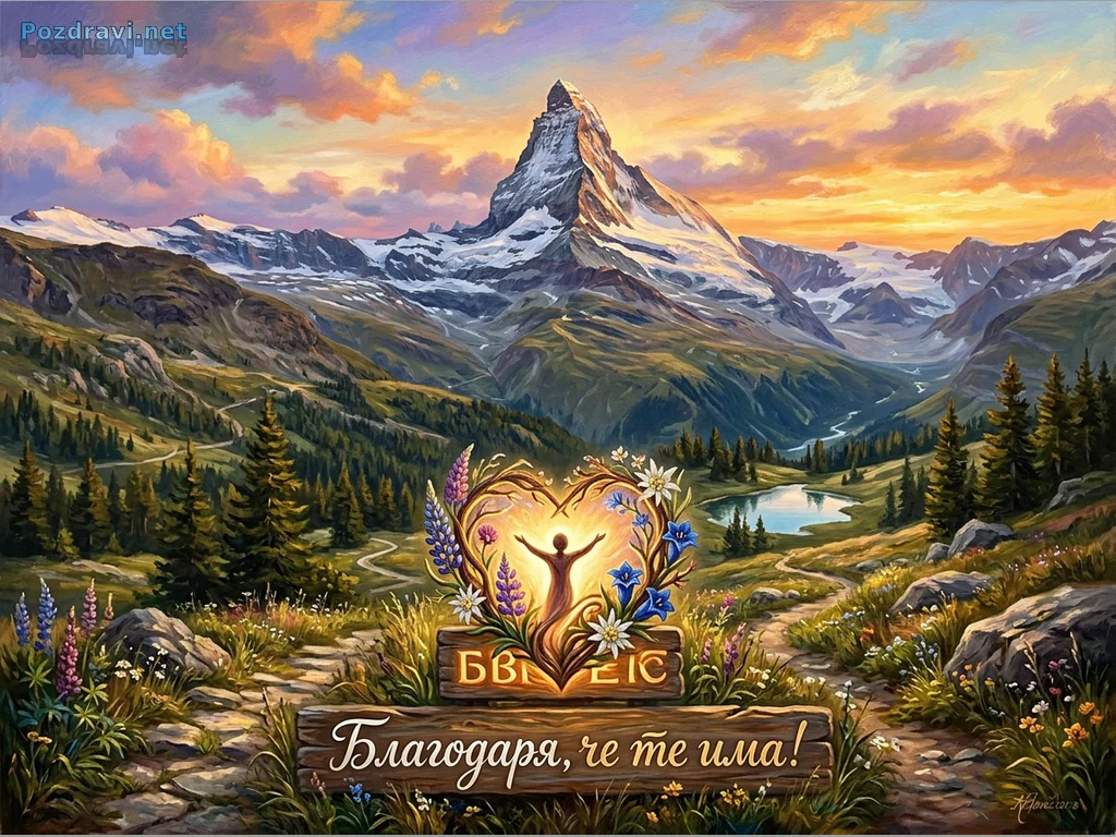 Живописна планинска сцена, доминирана от величествен заснежен връх, озарен от топлите цветове на залез или изгрев. В преден план се виждат тучни ливади с пътеки и разнообразни полски цветя, а в центъра е разположен сърцевиден венец от клонки и цветя, обгръщащ сияйна човешка фигура с разперени ръце. Под него има дървена табела с надпис 'Благодаря, че те има!', предаваща послание на признателност. Цялата композиция излъчва спокойствие, хармония и духовност сред спираща дъха природа.