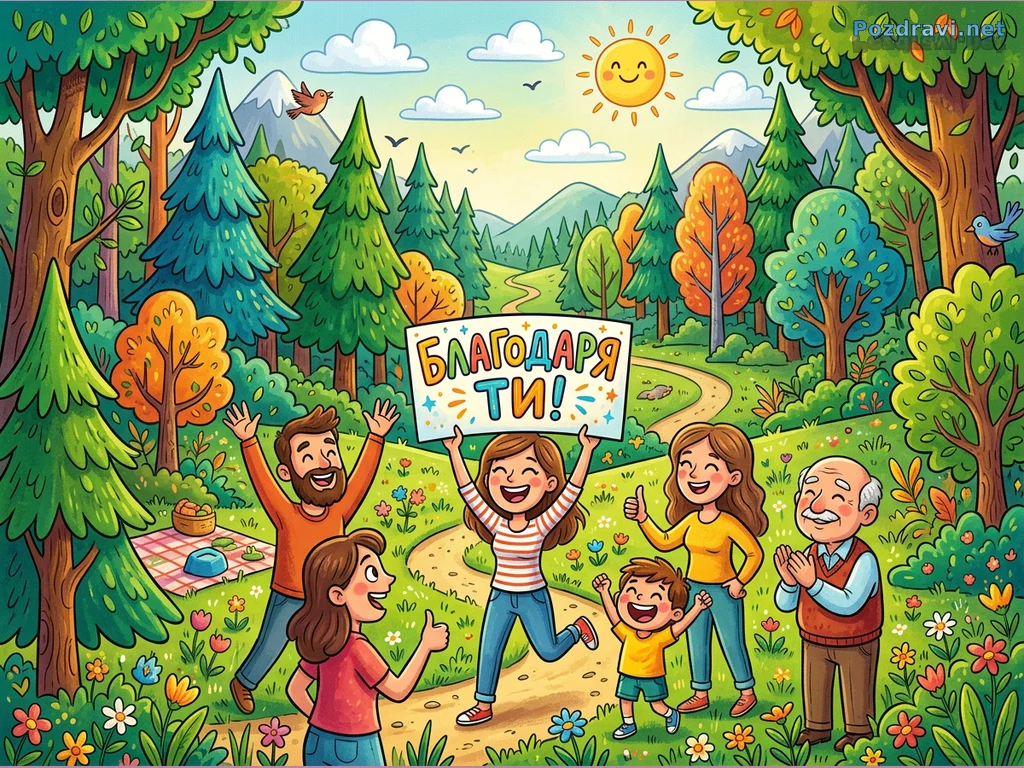Жизнерадостна сцена на открито. Група щастливи хора, се наслаждават на слънчев ден сред природата. В центъра е усмихната жена, която държи табела с надпис 'БЛАГОДАРЯ ТИ!', докато останалите членове на семейството – мъж, две други жени, малко момче и възрастен мъж – изразяват радост и одобрение с вдигнати ръце, палци нагоре и ръкопляскания.