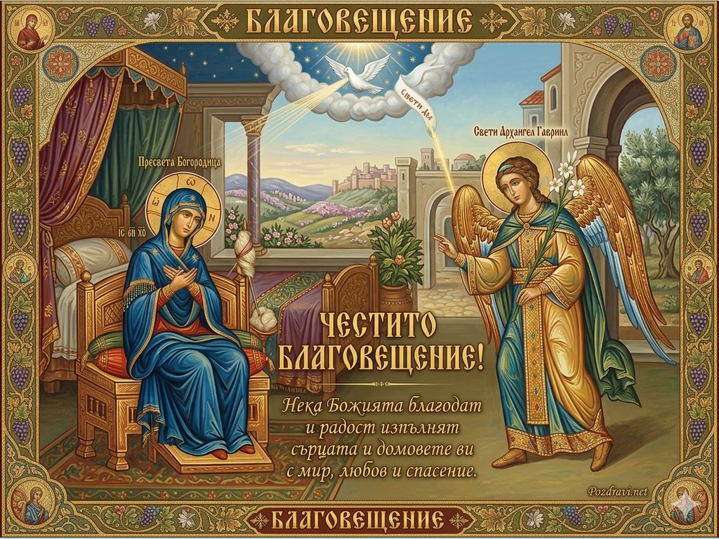 В долната част на иконата има надпис на български език: 'ЧЕСТИТО БЛАГОВЕЩЕНИЕ!', последван от молитва: 'Нека Божията благодат и радост изпълнят сърцата и домовете ви с мир, любов и спасение.'
