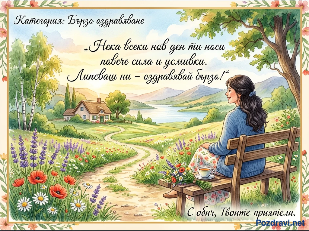 Тази акварелна картичка изобразява спокойна селска сцена с жена, седнала на дървена пейка. Тя гледа към живописно езеро, заобиколено от хълмове и планини, под ясно синьо небе. Пред нея се вие пътека през полета с макове, маргаритки и лавандула, водеща към уютна къщичка. На пейката до жената има букет цветя и чаша, а текстът гласи пожелание за бързо оздравяване от приятели.