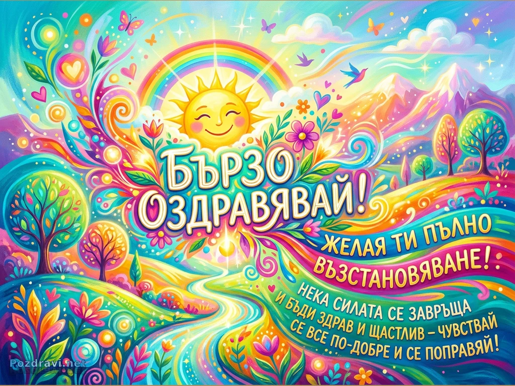 Тази дигитална илюстрация е изпълнена с ярки и жизнерадостни цветове, създаващи оптимистично настроение. В центъра на композицията е усмихнато слънце под дъга, заобиколено от летящи пеперуди и птици. Пейзажът е приказен, с хълмове, стилизирани дървета и цветя, през които тече лъкатушеща река, всичко в палитра от синьо, зелено, розово и жълто. Основното послание 'БЪРЗО ОЗДРАВЯВАЙ!' е изписано с големи букви, допълнено с пожелания за пълно възстановяване, здраве и щастие. Цялостната визия излъчва позитивна енергия и надежда за бързо оздравяване.