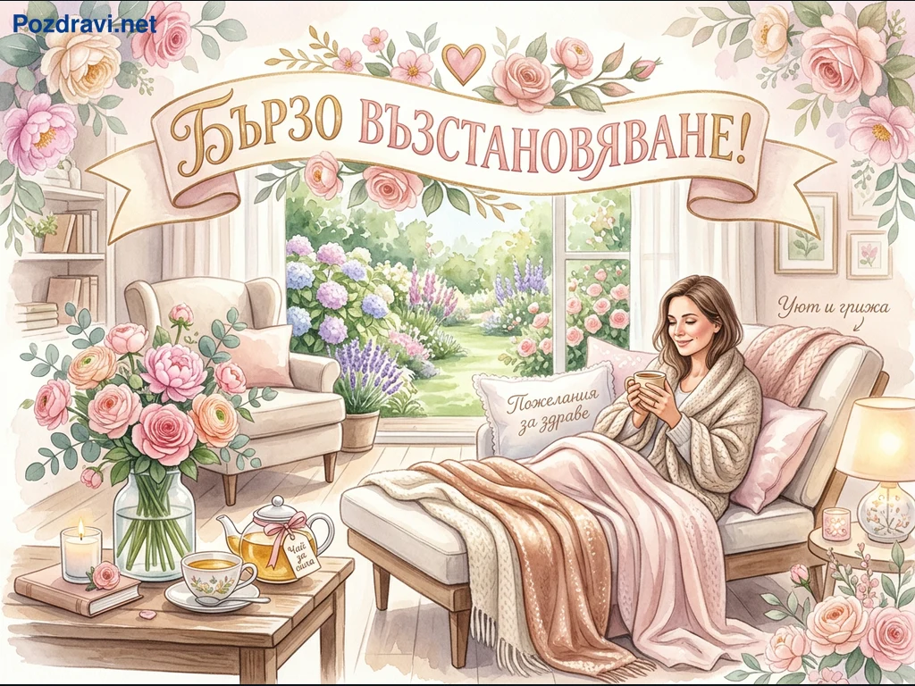 Тази акварелна илюстрация изобразява уютна стая, изпълнена с нежни пастелни тонове и флорални мотиви. В центъра е жена, удобно настанена на шезлонг, завита с меки одеяла, която отпива от чаша, докато гледа към разцъфнал градински пейзаж през голям прозорец. На преден план има маса с чайник, чаша чай, букет цветя и запалена свещ, създаващи атмосфера на спокойствие и грижа. Над сцената се вие лента с надпис 'БЪРЗО ВЪЗСТАНОВЯВАНЕ!', а до жената е възглавница с 'Пожелания за здраве'. Цялостната композиция предава послание за комфорт, възстановяване и благополучие.