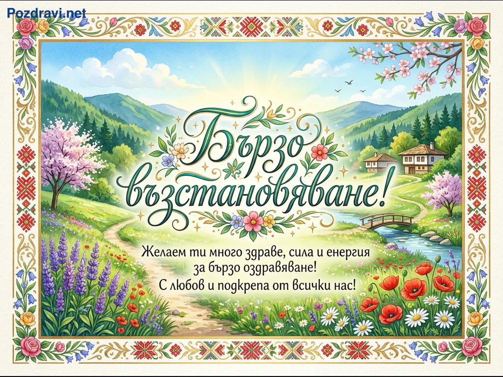 Картичката изобразява живописен пролетен пейзаж с тучни зелени хълмове, виеща се пътека, река с дървено мостче и традиционни български къщи. Цъфтящи дървета, лавандулови полета, макове и маргаритки красят предния план под ярко слънце. В центъра е изписано 'Бързо възстановяване!' с елегантна калиграфия, обградена от цветя и златни отблясъци, а под него има пожелание за здраве и подкрепа. Цялата композиция е оградена от богато украсен бордюр с български фолклорни мотиви и флорални елементи.