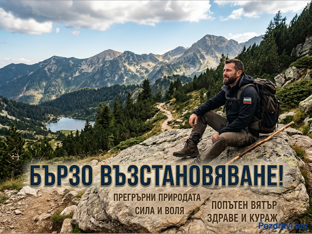 Мъж с брада, облечен в туристическа екипировка, седи на голяма скала, наслаждавайки се на величествена планинска панорама. Зад него се разкрива дълбока долина с гъсти иглолистни гори, криволичеща пътека и тюркоазено планинско езеро, обградено от високи върхове под облачно небе. На ръкава на якето му се вижда нашивка с българския флаг, а до него е подпряна туристическа тояга. Кадърът е допълнен с мотивиращи надписи като 'БЪРЗО ВЪЗСТАНОВЯВАНЕ!', 'Прегърни природата', 'Сила и воля' и 'Здраве и кураж', подчертаващи връзката между природата и човешкия дух.