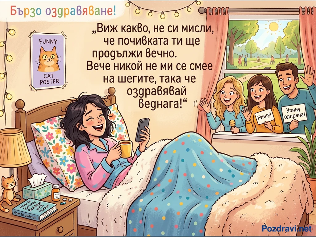 Млада жена лежи в леглото си, усмихната и смееща се, докато държи телефон и чаша. Тя е завита с пъстро одеяло и пухкава завивка, а на нощното шкафче до нея има лекарства, кърпички и книга за оцеляване при почивка в леглото с хумор. През прозореца трима приятели ѝ махат, държейки табели с надписи 'Funny!' и 'Урнну однярана!', докато навън грее слънце. Надписът в горната част на картичката гласи 'Бързо оздравяване!', а голям балон с текст приканва жената да оздравява веднага, защото 'Вече никой не ми се смее на шегите'.