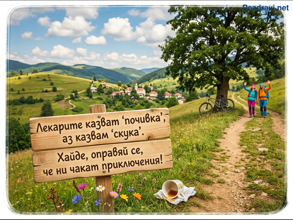 Снимката показва живописен планински пейзаж с тучни зелени хълмове и малко село, сгушено в далечината под ясно синьо небе с пухкави облаци. В преден план е поставен дървен указател сред диви цветя, носещ хумористично послание за почивка и приключения. Пътека се вие през тревистия склон, водеща към голямо дъбово дърво, до което е подпрян велосипед. В далечината се виждат двама туристи с раници, които махат, а до знака лежи обърната чаша с разлято кафе, символизираща края на кратка почивка и призив за действие. Цялостната атмосфера е приканваща към приключения и активен отдих сред природата.