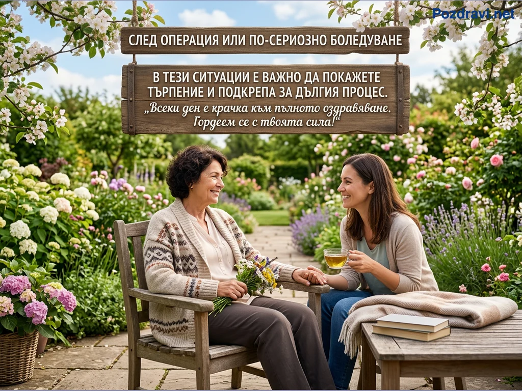 Две жени, вероятно майка и дъщеря, седят в разцъфнала градина, споделяйки топъл и подкрепящ момент. По-възрастната жена държи букет цветя и се усмихва към по-младата, която държи чаша чай и нежно я държи за ръка. Над тях виси дървена табела с послание за търпение и подкрепа по време на възстановяване. Текстът гласи: 'СЛЕД ОПЕРАЦИЯ ИЛИ ПО-СЕРИОЗНО БОЛЕДУВАНЕ / В ТЕЗИ СИТУАЦИИ Е ВАЖНО ДА ПОКАЖЕТЕ ТЪРПЕНИЕ И ПОДКРЕПА ЗА ДЪЛГИЯ ПРОЦЕС. 'Всеки ден е крачка към пълното оздравяване. Гордеем се с твоята сила!''. Сцената е изпълнена с красота и спокойствие, с изобилие от цъфтящи храсти и дървета.