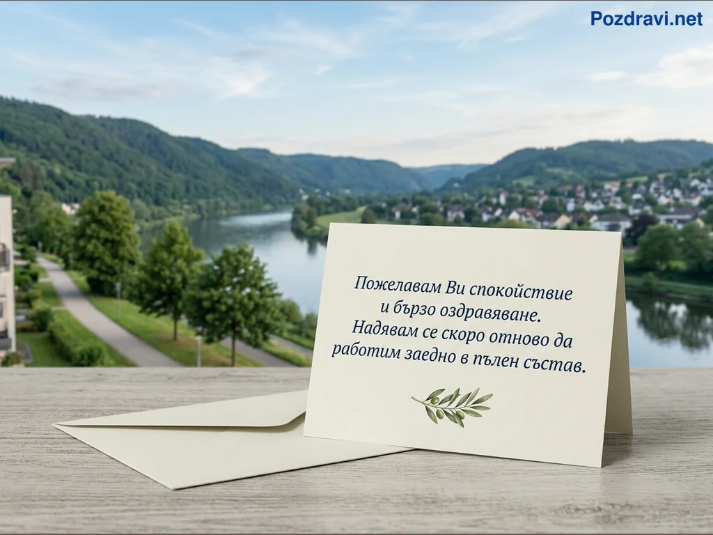 На преден план е показана отворена поздравителна картичка в кремав цвят, поставена върху светла дървена повърхност. До нея лежи отворен плик в същия цвят. Картичката съдържа текст на български език с пожелания за спокойствие и бързо оздравяване, както и надежда за скорошна съвместна работа в пълен състав, а под него има илюстрация на маслинова клонка. Фонът разкрива живописен пейзаж с река, виеща се между зелени хълмове, покрити с гори, под ясно синьо небе. В далечината се виждат къщи от населено място, а вляво – част от сграда и алея с дървета.