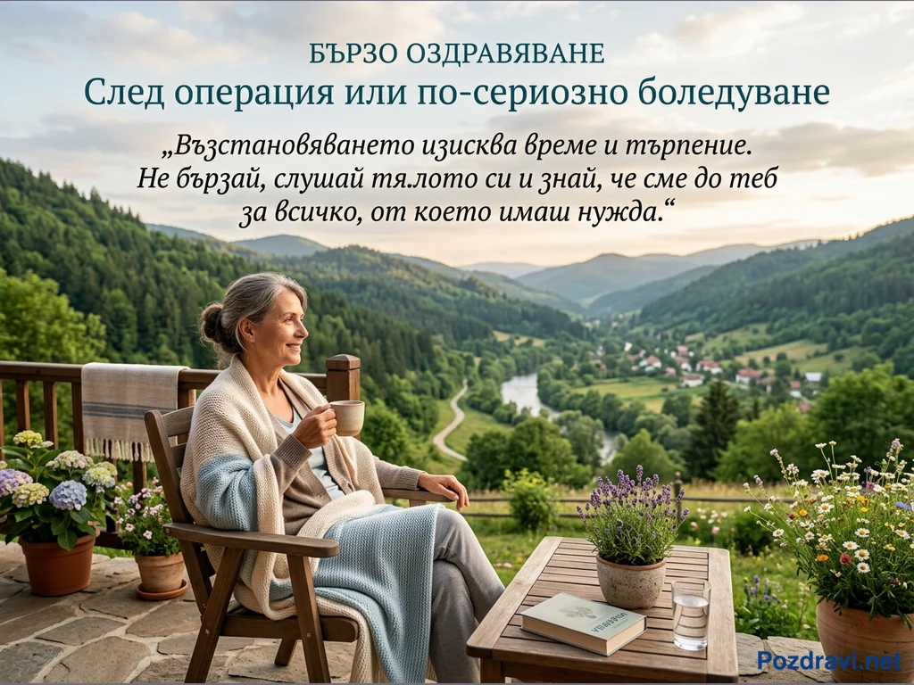 Възрастна жена с бяла коса, облечена в уютна жилетка и одеяло, седи на дървен стол на тераса. Тя държи чаша и гледа с усмивка към обширна планинска долина, осеяна със зелени гори, река и малко селище. На терасата има саксии с хортензии, лавандула и маргаритки, както и дървена маса с книга и чаша вода. Над сцената е изписано 'БЪРЗО ОЗДРАВЯВАНЕ След операция или по-сериозно боледуване' и вдъхновяващ цитат за търпението при възстановяване. Атмосферата е спокойна и предразполагаща към почивка и възстановяване.
