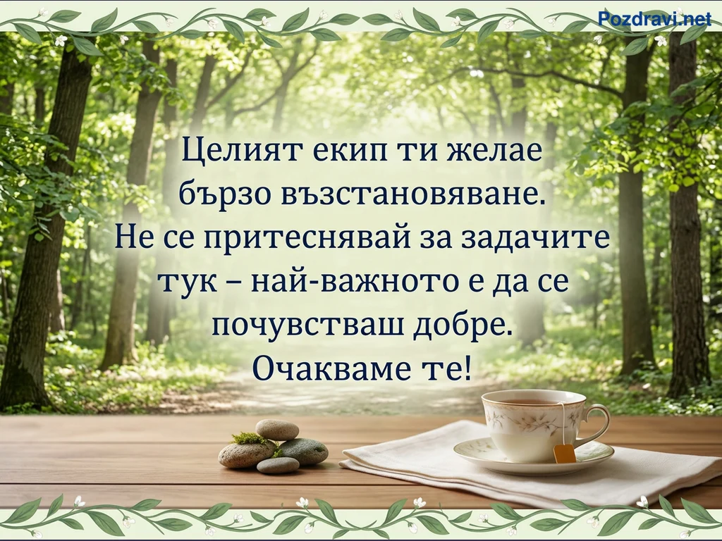 Ключови фрази: Пожелание за бързо оздравяване, Картичка от екип, Съобщение за възстановяване, Релаксираща горска обстановка, Чаша чай и камъни