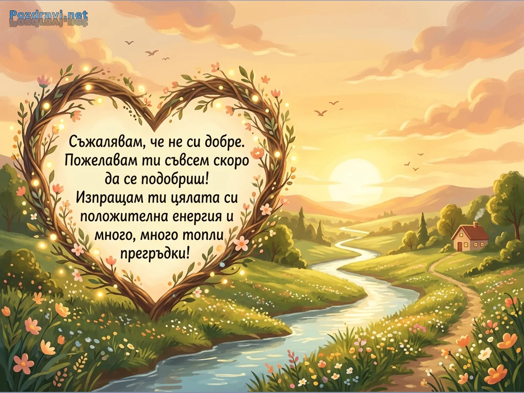 Тази илюстрация показва живописен пейзаж по залез или изгрев слънце, изпълнен с топли цветове. В центъра на преден план е оформено сърце от преплетени клони, украсени с цветя и светлинки, което съдържа послание за бързо оздравяване. На заден план се виждат хълмове, през които лъкатуши река, а в далечината грее голямо слънце. Малка къщичка с димящ комин и пътека допълват идиличната сцена, докато птици летят в небето.