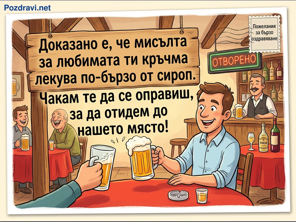 Карикатурна илюстрация показва весела сцена в традиционна кръчма. В центъра е усмихнат мъж, който държи халба бира и се готви да се чукне с друг човек, чиято ръка се вижда. На заден план други посетители се наслаждават на напитки, а зад бара стои усмихнат барманец. Голям дървен надпис гласи: 'Доказано е, че мисълта за любимата ти кръчма лекува по-бързо от сироп. Чакам те да се оправиш, за да отидем до нашето място!'. В горния десен ъгъл има печат с пожелание за бързо оздравяване.