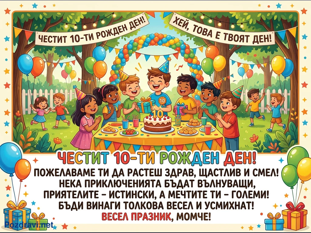 Ключови фрази: 10-ти рожден ден, детско парти, поздравителна картичка, весели деца, празник на открито