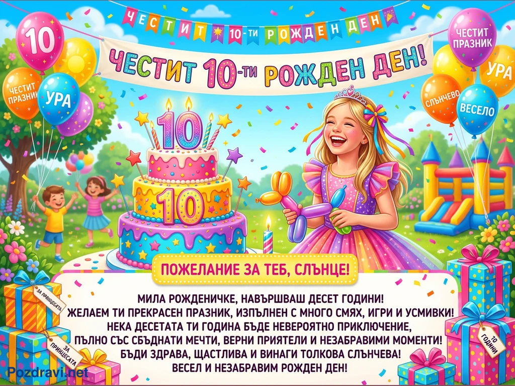 Ярко и весело изображение на детски рожден ден, отбелязващ 10-годишнина. В центъра е усмихнато момиче в цветна рокля, държащо балон-животно, до голяма триетажна торта с цифрата '10' и свещи. Небето е изпълнено с балони, конфети и празничен транспарант 'ЧЕСТИТ 10-ти РОЖДЕН ДЕН!'. На заден план се виждат играещи деца и надуваем замък, създавайки празнична атмосфера. В долната част има подаръци и пожелание за рожденичката.