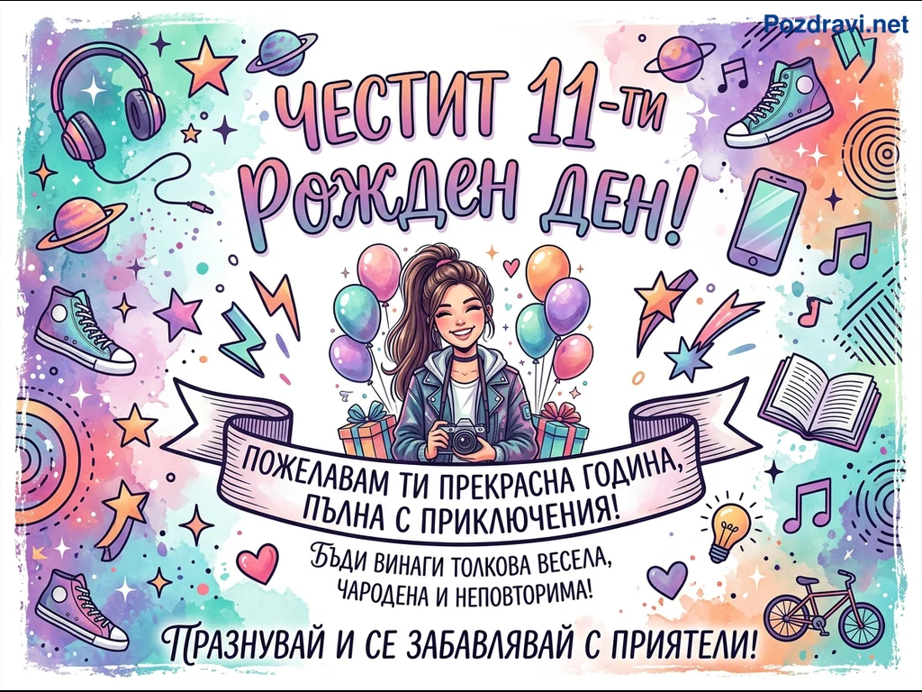 Тази цветна картичка за рожден ден е посветена на 11-годишно момиче. В центъра е изобразена усмихната девойка с фотоапарат, обградена от балони и подаръци. Фонът е изпълнен с акварелни пръски в пастелни нюанси, а около нея са разпръснати елементи като слушалки, кецове, планети, музикални ноти, смартфон и книга. Посланията 'ЧЕСТИТ 11-ти РОЖДЕН ДЕН!' и 'ПОЖЕЛАВАМ ТИ ПРЕКРАСНА ГОДИНА, ПЪЛНА С ПРИКЛЮЧЕНИЯ!' допълват празничната атмосфера.
