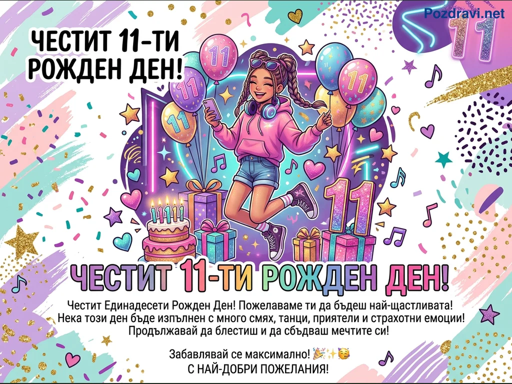Тази празнична картичка за рожден ден е изпълнена с ярки цветове и енергия. В центъра е изобразено усмихнато момиче с плитки, облечено в розов суитшърт и къси панталони, което подскача щастливо. Около нея има балони с числото '11', подаръци, торта със свещи и неонови елементи. Фонът е украсен с конфети, звезди, сърца и музикални ноти, създавайки весела и модерна атмосфера. Текстът 'ЧЕСТИТ 11-ТИ РОЖДЕН ДЕН!' е изписан на няколко места, допълнен с пожелания.