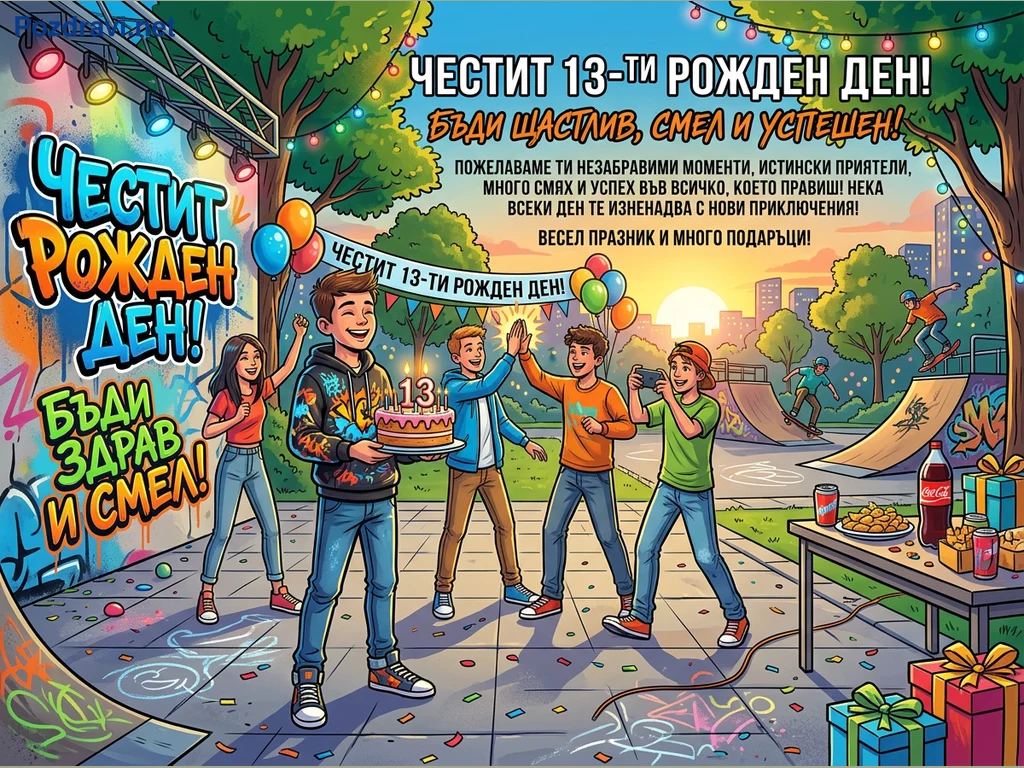 Ключови фрази: 13-ти рожден ден, празник тийнейджъри, поздравления рожден ден, скейт парк парти, честитка за 13 години