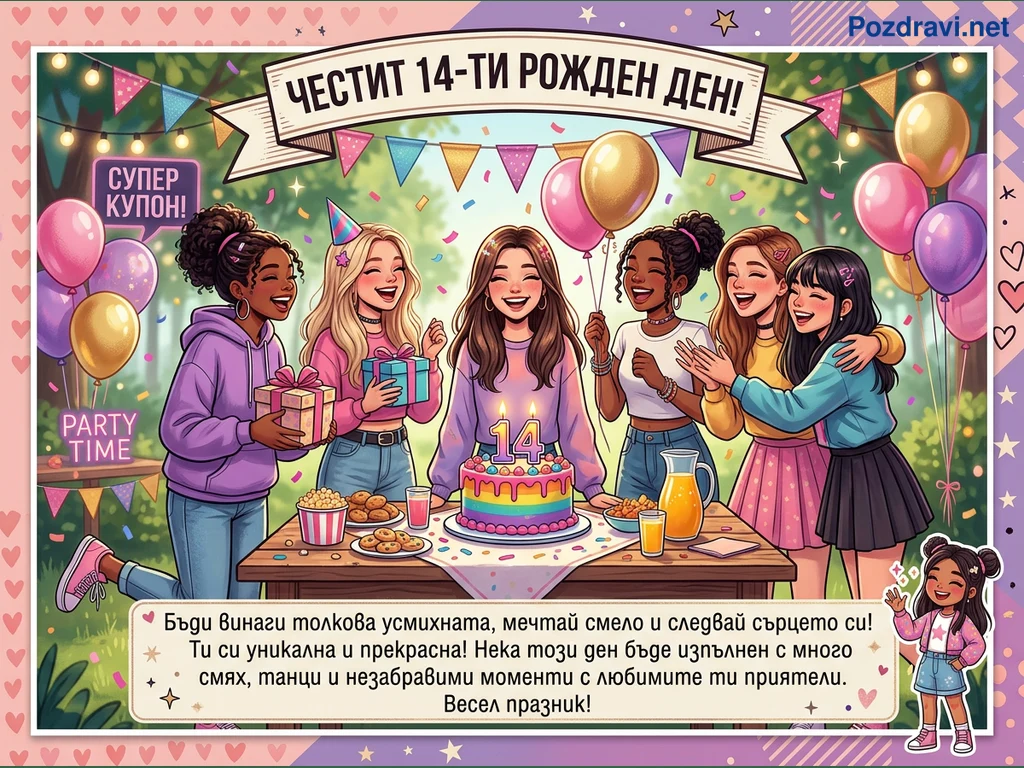 Тази жизнерадостна илюстрация изобразява група от шест усмихнати млади жени, празнуващи 14-и рожден ден на открито. Централната фигура стои пред цветна торта с две свещи във формата на числото 14, докато приятелките ѝ я обграждат с подаръци и прегръдки. Сцената е украсена с балони, гирлянди и конфети, а на дървена маса са подредени лакомства като пуканки, бисквити и сок. Надписът 'ЧЕСТИТ 14-ТИ РОЖДЕН ДЕН!' и посланието за щастие допълват празничната атмосфера.