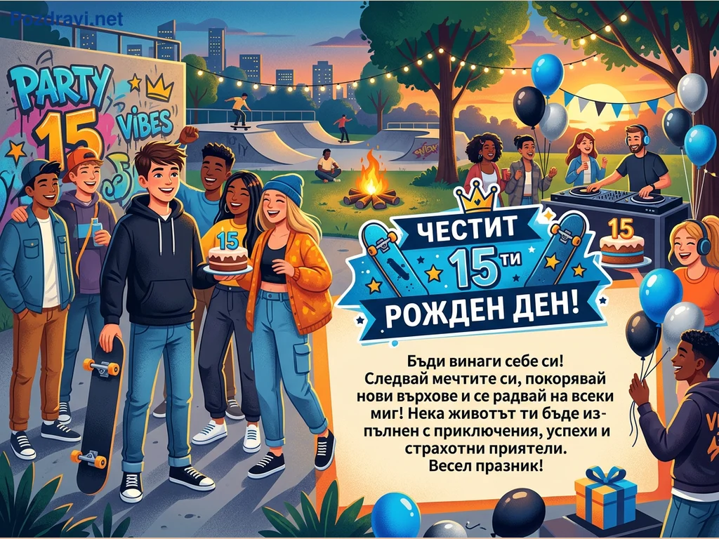 Ключови фрази: 15-ти рожден ден, парти за тийнейджъри, поздравителна картичка, скейтпарк празник, младежко събиране