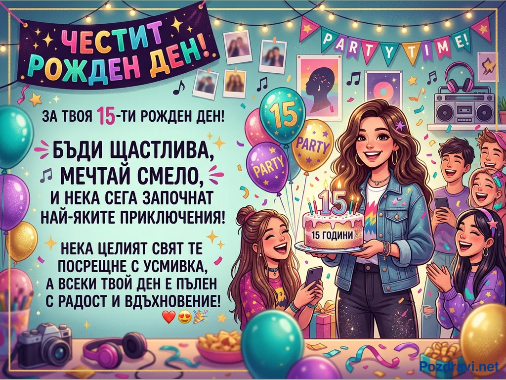 Тази цветна картичка празнува 15-ти рожден ден, изобразявайки усмихнато момиче, държащо торта с горящи свещи '15 години'. Тя е заобиколена от весели приятели, които се смеят и аплодират, създавайки оживена парти атмосфера. Фонът е украсен с балони, конфети, гирлянди с надпис 'PARTY TIME!' и снимки, докато на преден план има камера, слушалки и лакомства. Картичката съдържа сърдечни пожелания за щастие, смели мечти и вълнуващи приключения.