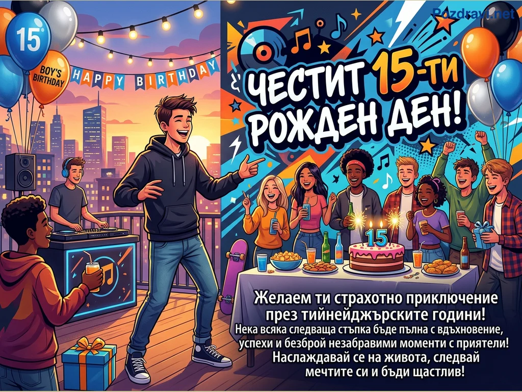 Тази цветна илюстрация е поздравителна картичка за 15-ти рожден ден, изобразяваща оживено тийнейджърско парти. Лявата част показва DJ, пускащ музика на покрив с градски пейзаж на заден план, украсен с балони с числото '15' и надпис 'HAPPY BIRTHDAY'. В дясната част, група от усмихнати и разнообразни младежи се е събрала около маса с торта, свещи и напитки, под голям надпис 'ЧЕСТИТ 15-ТИ РОЖДЕН ДЕН!'. Общата атмосфера е празнична и изпълнена с радост, подчертана от ярките цветове и динамичните пози на героите. В долния десен ъгъл има пожелание за тийнейджърските години.